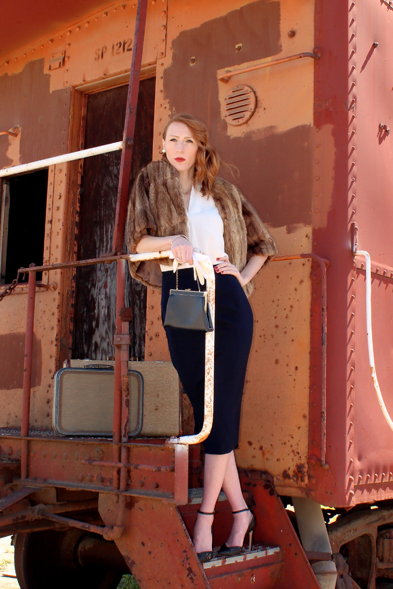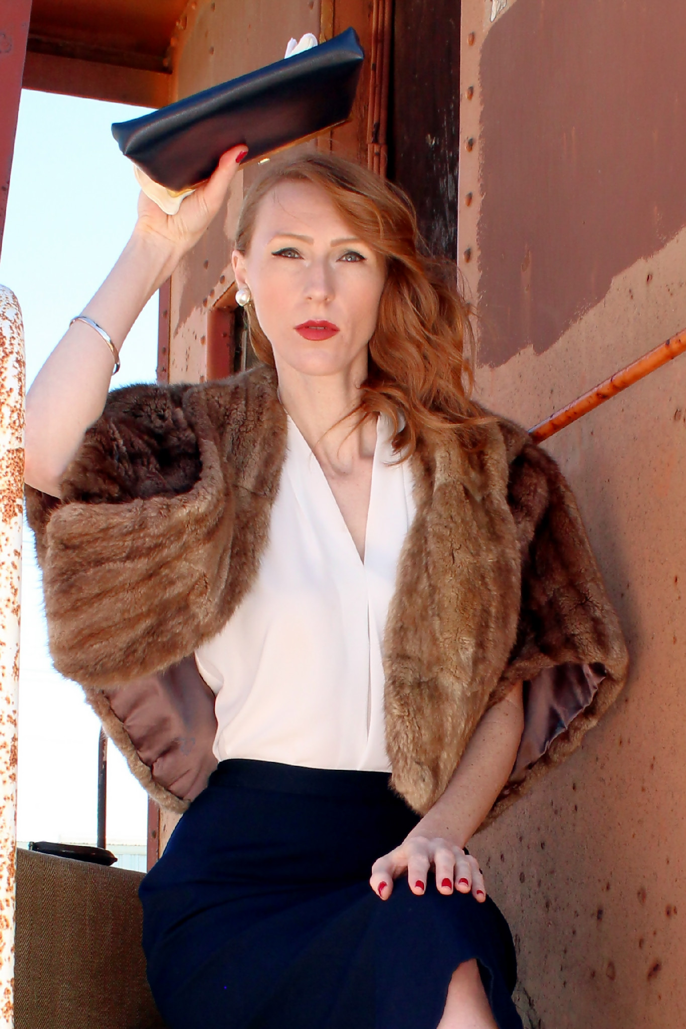 Vintage Fur Shrug (similar here) Vince Camuto Pleat Front Blouse Vintage Wool Pencil Skirt (Doris Alexander, similar here) Vintage Navy Blue Leather Clutch (similar here) Pearl Earrings Macy’s Vintage White gloves Dolce Vita Woven Ankle Strap Pumps Vintage Luggage (similar here)
