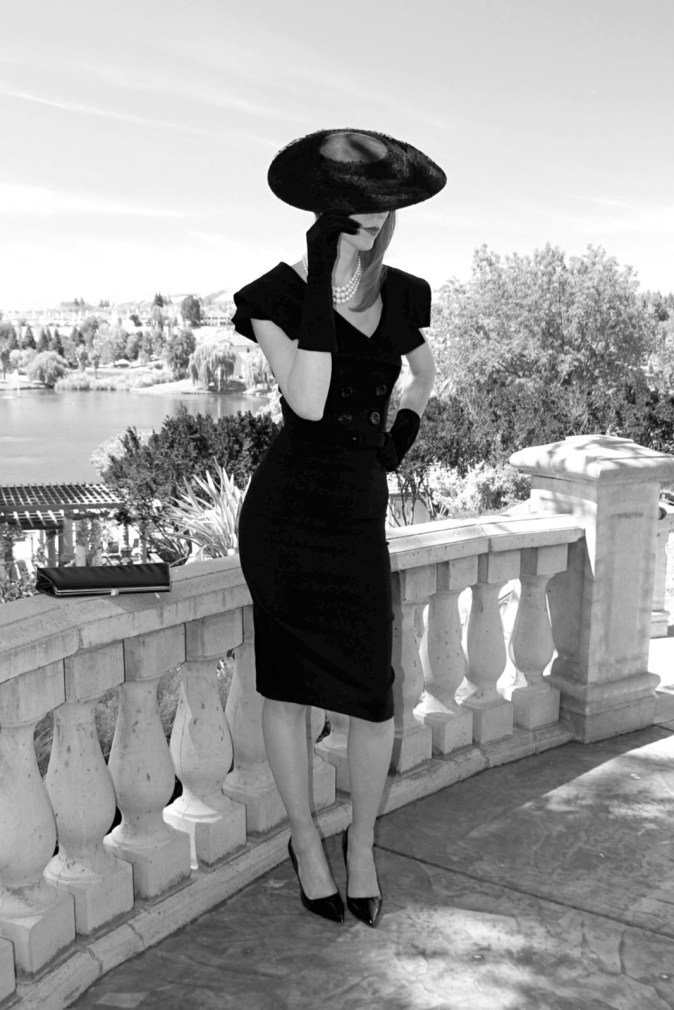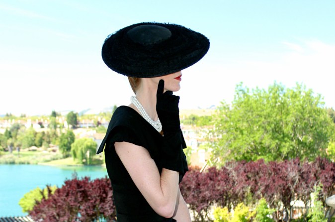 Tatyana Secretary Pencil Dress (similar here) Vintage Cartwheel Hat (similar here) Rope Pearl Necklace & Double Drop Earrings (Vintage Heirloom, Theresa Fisher, similar here & here) Vintage Gloves (similar here) Vintage Leather Clutch (similar here) Kate Spade Black Patent ‘Licorice Too’ Pumps