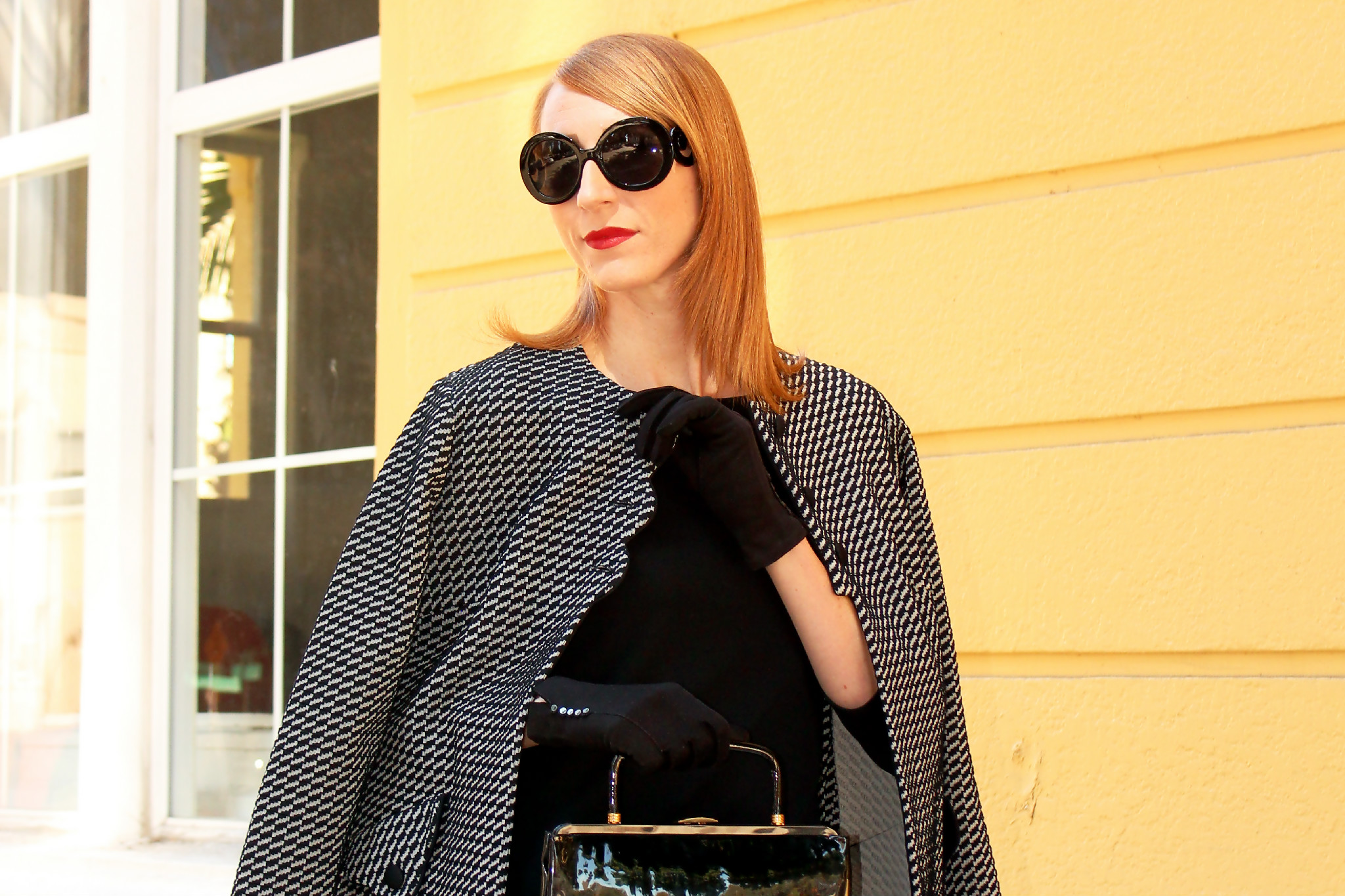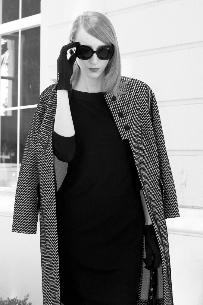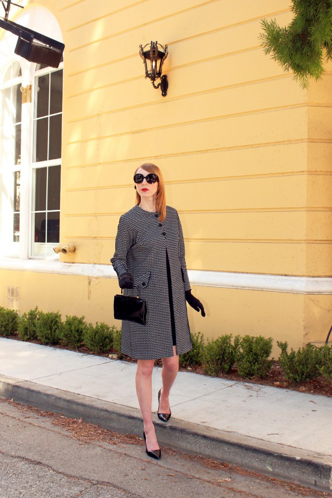Banana Republic Boat Neck Dress (similar here or here) Mod-Inspired Swing Coat Expressly Made for SEARS (similar here) Prada Round Baroque Sunglasses Kate Spade NY ‘Licorice’ Pumps Vintage Patent Handbag (similar here)