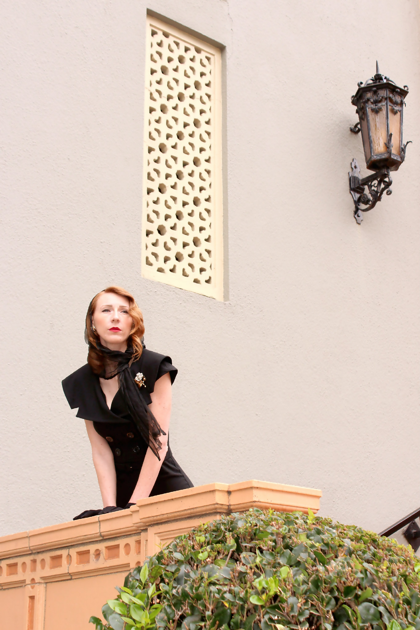 Tatyana Boutique Double Breasted Sheath (similar here) Vintage Sheer Silk Scarf, Doris Alexander (similar here) Rose Rhinestone Brooch (similar here) Glass Paved Gold-Tone Earrings J.Colleen (similar here) Antique Co Vintage Ivory Button Gloves Vintage Leather Clutch, Doris Gibson (similar here) Ivanka Trump Suede Pumps