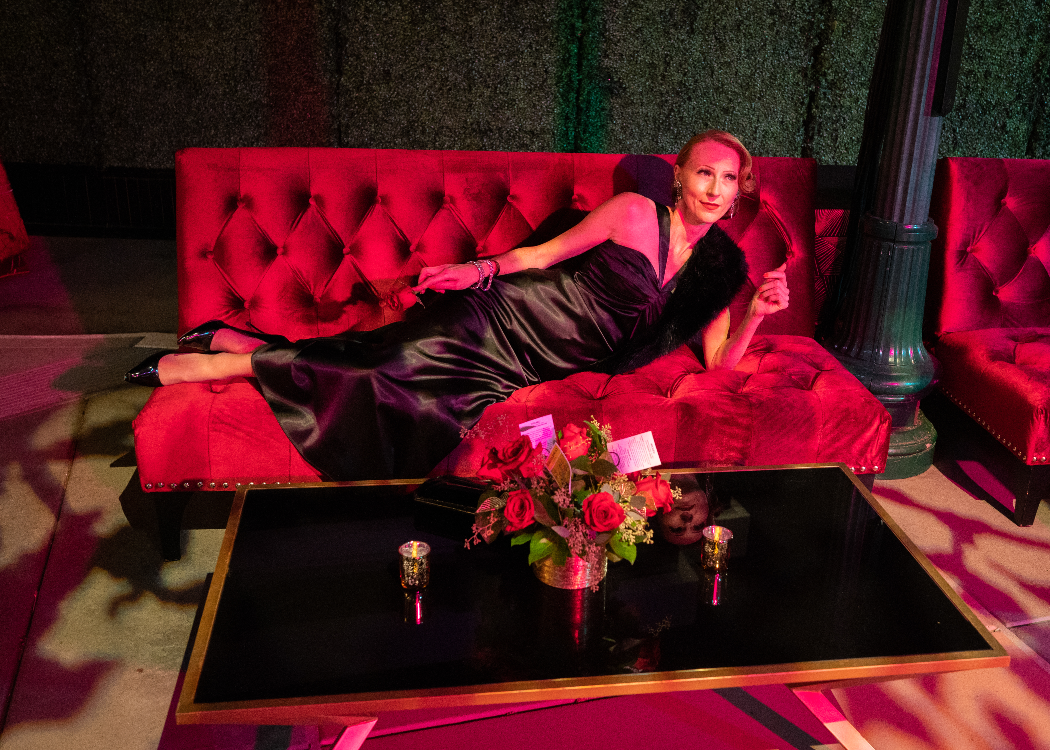 This year’s annual outdoor fundraising gala featured a red-carpet cocktail hour with wine provided by Wente Vineyards among an array of art deco décor throughout. Walking in with grace, I felt like an Old Hollywood Actress wearing a elegant satin gown by Sahara & patent designer heels. In addition, I couldn’t help but up the glamour with a stunning pair of deco rhinestone earrings, an over-the-shoulder black fur stole and the reddest lips c/o Tom Ford Beauty.