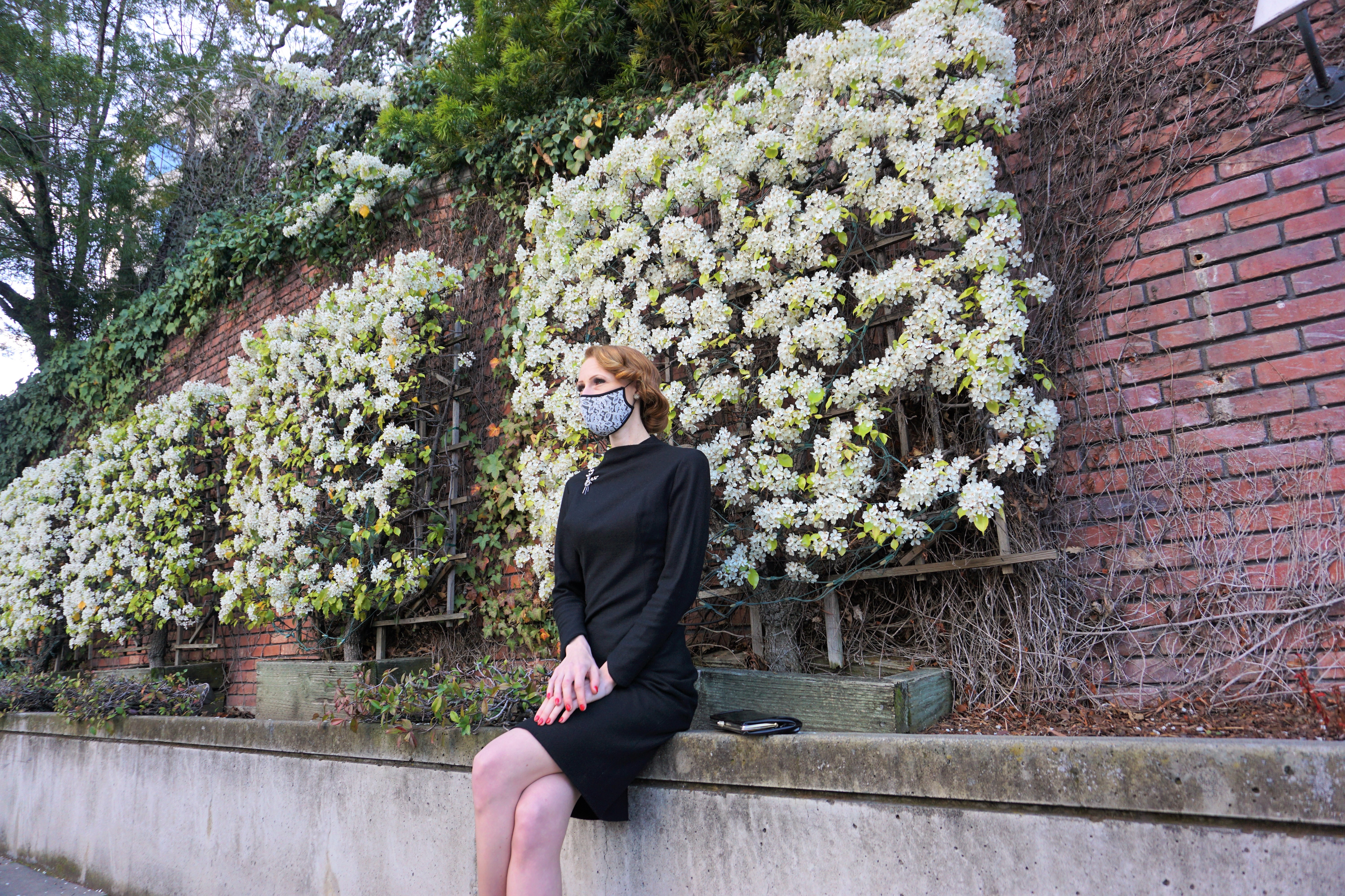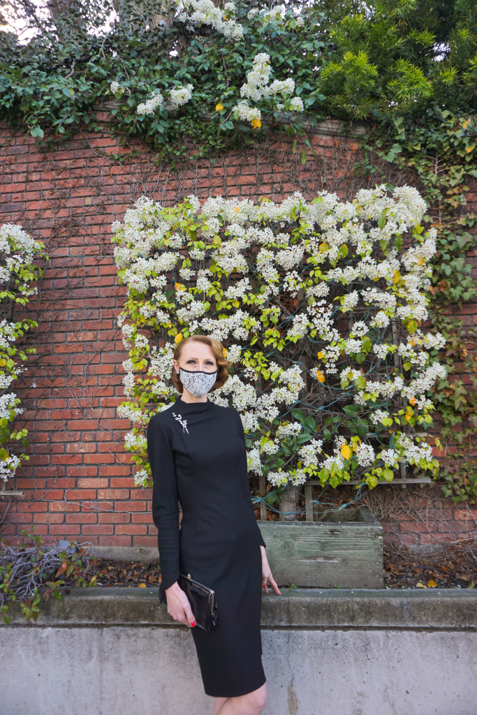 Face coverings (to some) may still feel like an unusual addition to their daily routines because of the way they conceal ones smile, however the level of protection is priceless. A style note you might opt for is seeking a pattern or print that suits your personal aesthetic or outfit as I did in today’s post. I paired their white “Lacey” with one of my beloved 1950s wool sheath with a vintage floral rhinestone brooch and studded earrings. I finished the overall look off with shiny patent accessories. I created an outfit that not only protects, it showcases elegance and grace.